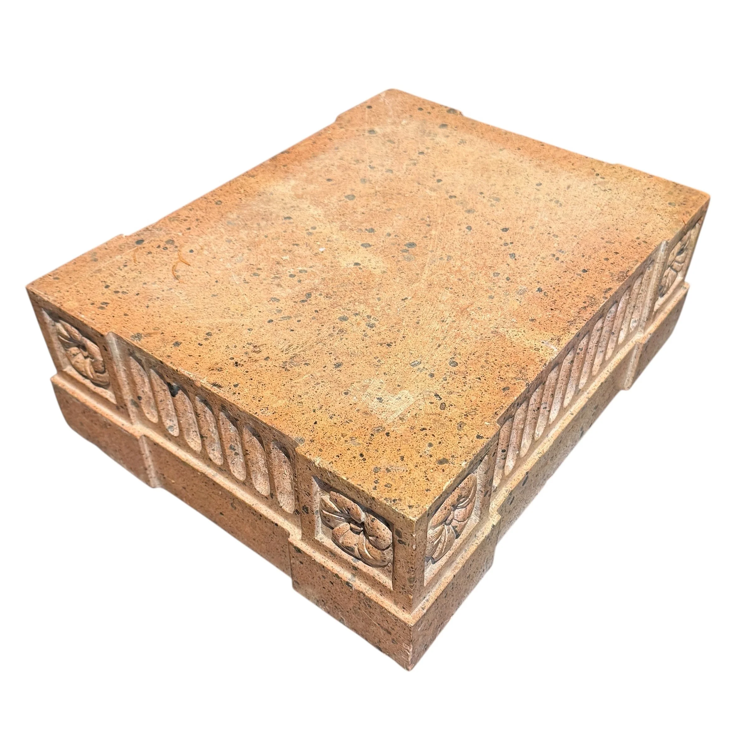 Carved from warm pink Cantera stone, this architectural fragment—likely Mexican in origin—offers a beautifully weathered glimpse into classical design. Rectangular in form and substantial in weight, the piece was likely once the base of a pedestal, pilaster, or sculptural element as evidenced by the faded shadow on the top surface. Fluted sides give it a sense of rhythm and verticality, while carved floral medallions anchor each corner with quiet ornamentation. Though modest in scale, its mass and material give it a commanding presence. The soft pink hue and gentle surface wear speak to age and exposure, lending it the kind of patina only time can create. Whether used as a plinth for a favorite sculpture, candle, or cherished object, it adds a grounded, architectural note to any space—equal parts timeless and tactile.